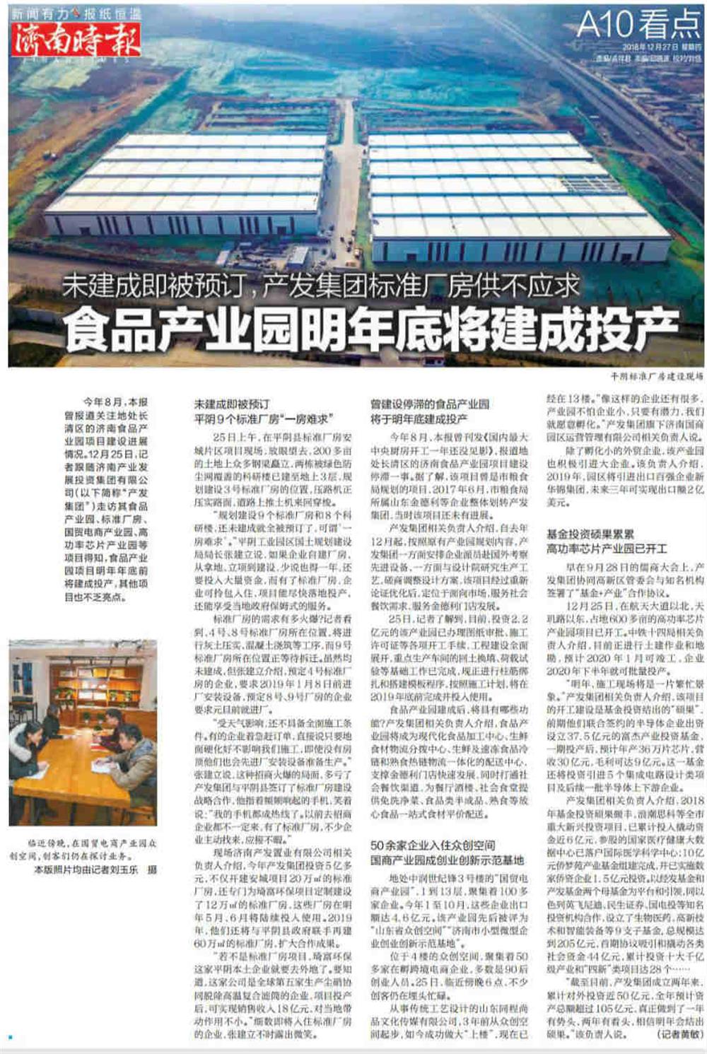 今年8月,本報(bào)曾刊發(fā)《國內(nèi)最大中央廚房開工一年還沒見影》,報(bào)道地處長(zhǎng)清區(qū)的濟(jì)南食品產(chǎn)業(yè)園項(xiàng)目建設(shè)停滯一事。12月25日,記者跟隨濟(jì)南產(chǎn)業(yè)發(fā)展投資集團(tuán)有限公司(以下簡(jiǎn)稱“產(chǎn)發(fā)集團(tuán)”)走訪其食品產(chǎn)業(yè)園、標(biāo)準(zhǔn)廠房、國貿(mào)電商產(chǎn)業(yè)園、高功率芯片產(chǎn)業(yè)園等項(xiàng)目,得知食品產(chǎn)業(yè)園項(xiàng)目明年年底前將建成投產(chǎn),其他項(xiàng)目也不乏亮點(diǎn)。